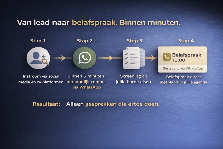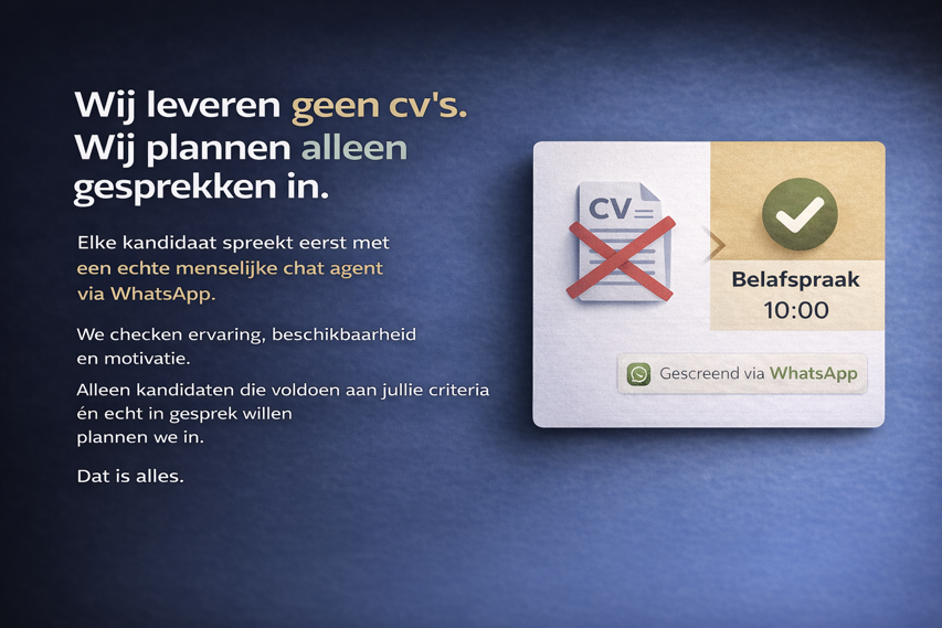 Elke kandidaat wordt persoonlijk benaderd en gesproken via WhatsApp. Geen standaardformulieren, geen geautomatiseerde antwoorden, maar direct contact. Dat zorgt voor betere matches, hogere show rates en serieuzere gesprekken.