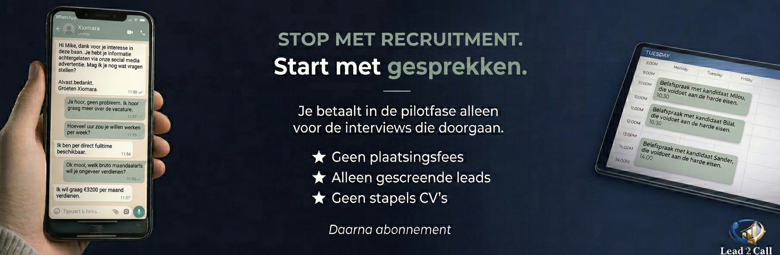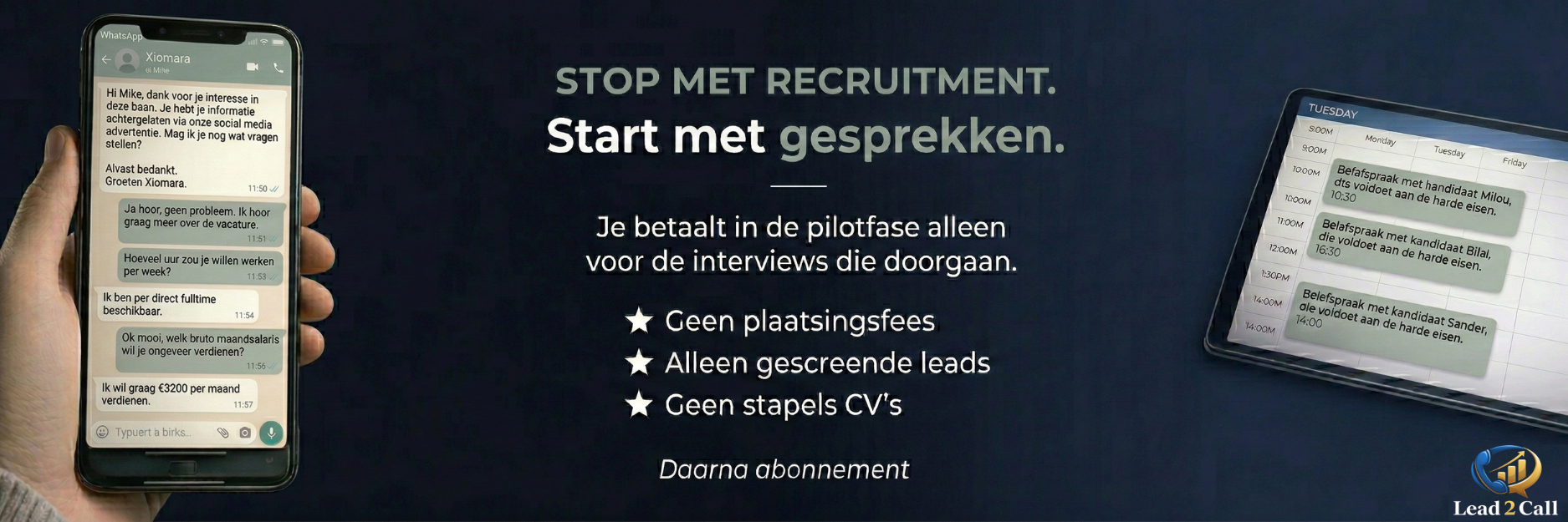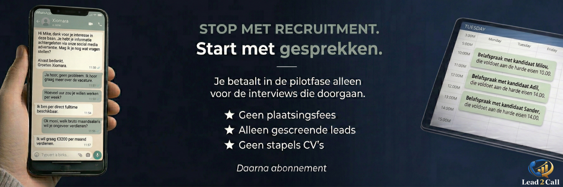 Lead2Call is geen recruitmentbureau en wij leveren geen cv’s. Wij vullen je agenda met gescreende belafspraken.