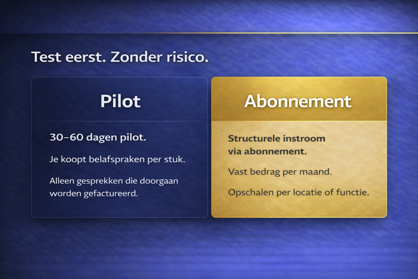 Je start met een pilot van 30 tot 60 dagen. In die periode koop je belafspraken per stuk en betaal je uitsluitend voor gesprekken die daadwerkelijk plaatsvinden.